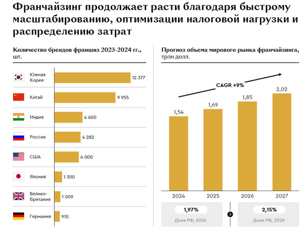По количеству франчайзинговых брендов Россия уже занимает четвертое место в мире после Южной Кореи, Китая и Индии. Вместе с тем ее доля в мировом рынке пока составляет около 1,9%, что указывает на значительный потенциал дальнейшего роста. По оценкам экспертов, к 2029 г. этот показатель может вырасти до 2,15%.