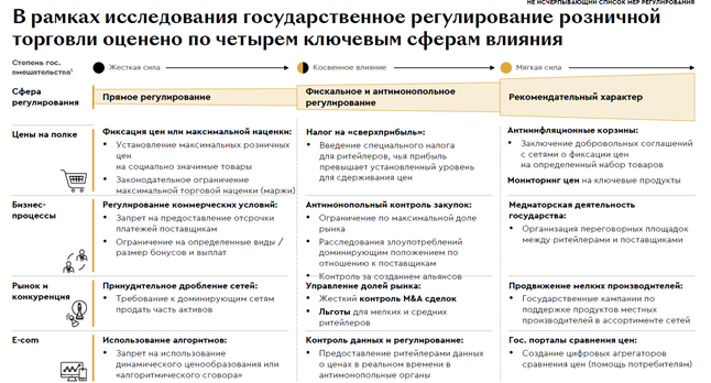 Как полагают эксперты, в условиях того, что франчайзинг становится главным инструментом экспансии, его регулирование должно не подменять рыночную логику, а создавать более предсказуемые и справедливые условия для масштабирования сети.  Авторы отчета отмечают, что в большинстве из рассмотренных стран — Бразилии, Китае, Мексике, США, Германии и Польши —государство не делает ставку на жесткое прямое регулирование доли и действий игроков на рынке. Вместо этого используются точечные меры — рассмотрение антимонопольных сделок в индивидуальном порядке, контроль за ростом цен на социально значимые товары, временное снижение НДС, добровольные соглашения с ритейлерами и субсидии производителям.