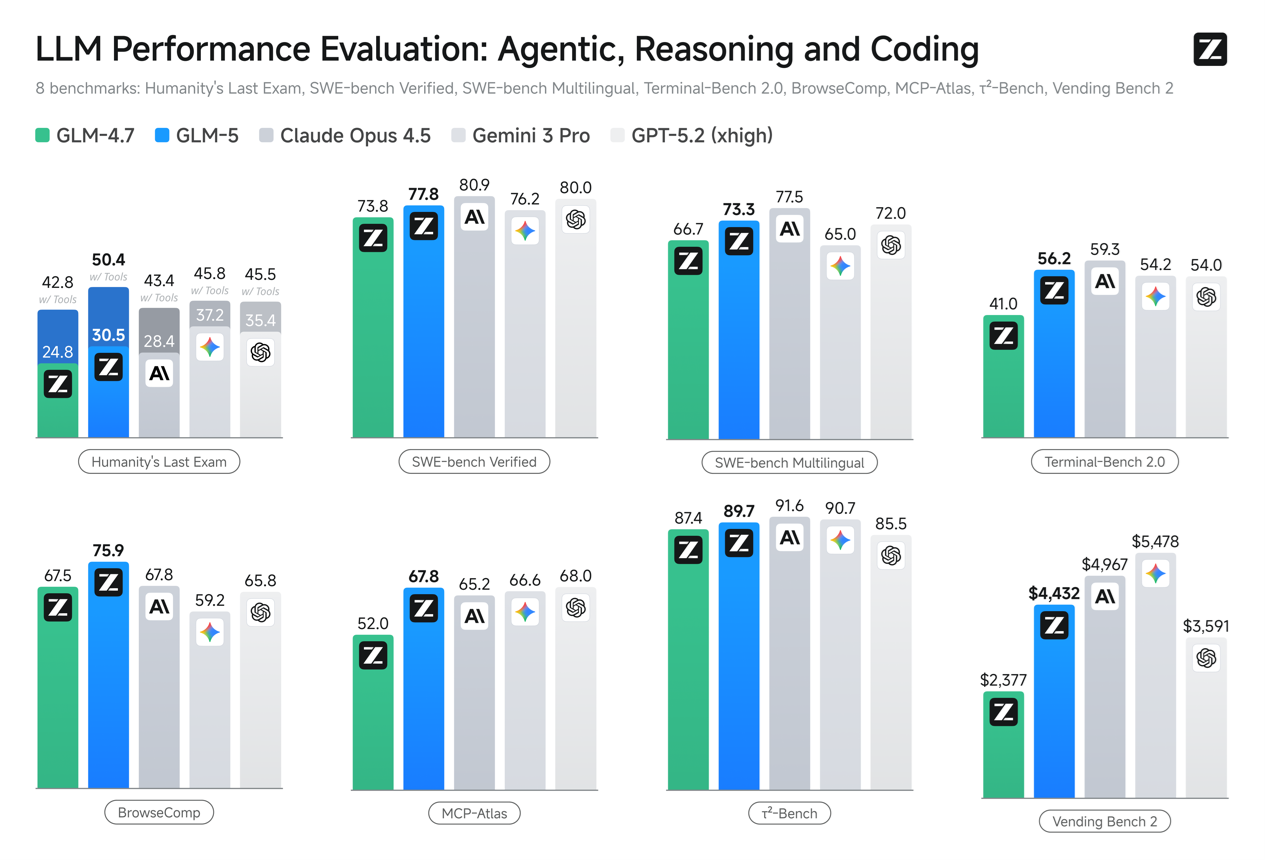 Результаты тестирований подтверждают заметный прогресс. На бенчмарках SWE-bench-Verified и Terminal Bench 2.0 модель получила 77,8 и 56,2 балла соответственно — это самые высокие показатели среди open-source моделей на данный момент, а в ряде задач программной инженерии GLM-5 опережает Gemini 3 Pro. В тесте Vending Bench 2, имитирующем управление бизнесом по продаже товаров через автомат в течение года, модель завершила симуляцию с балансом 4 432 доллара, продемонстрировав лучшие результаты среди открытых моделей в управлении операционной и экономической деятельностью.